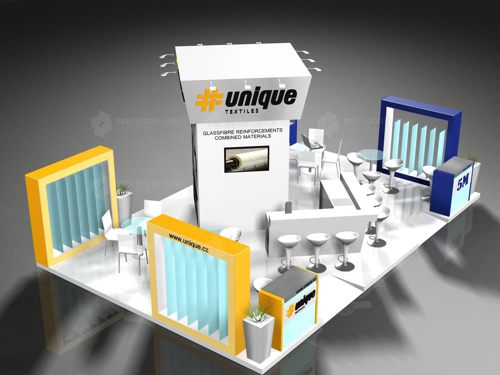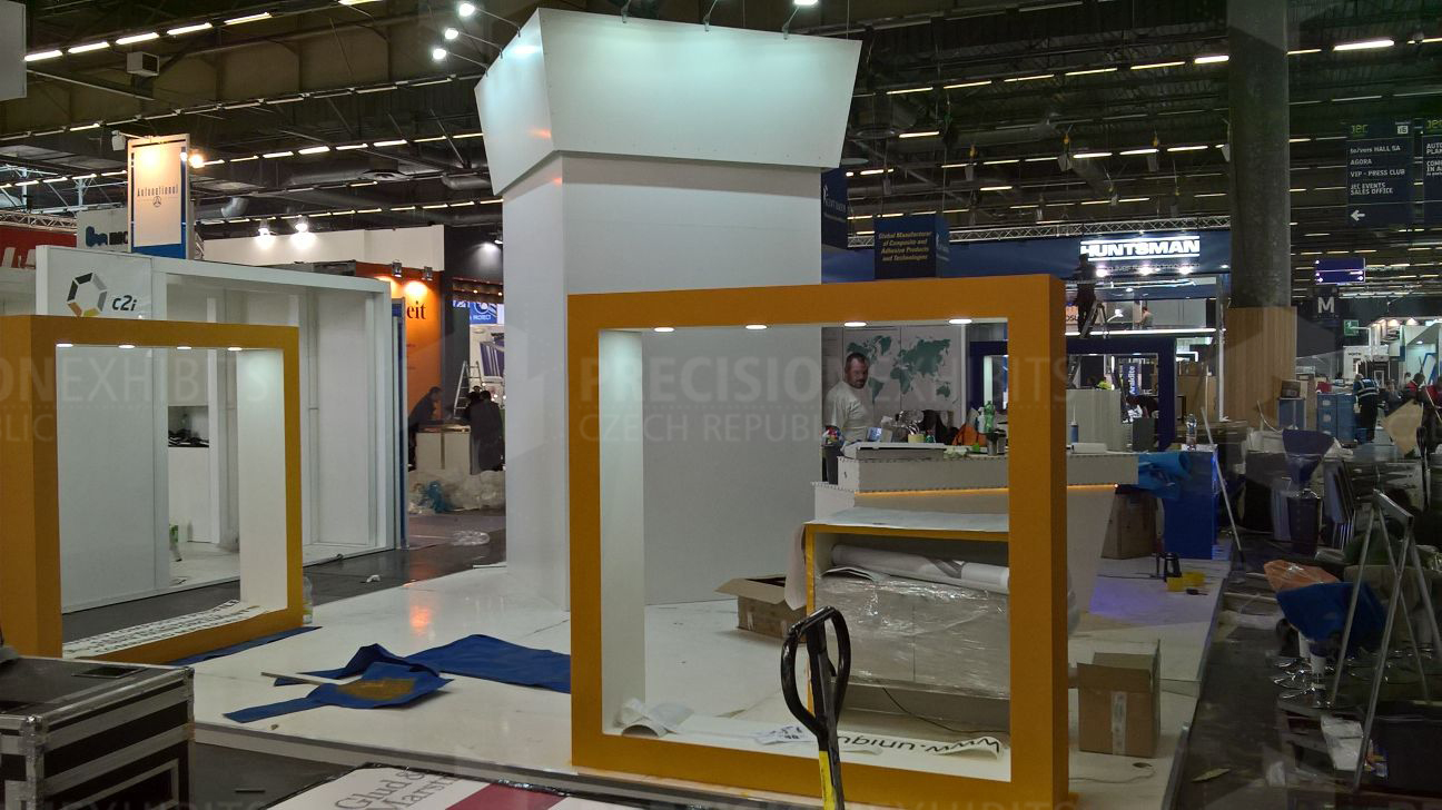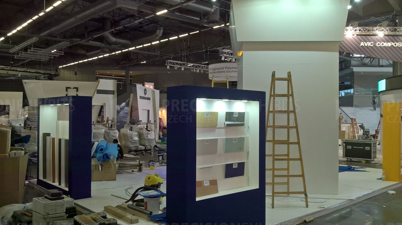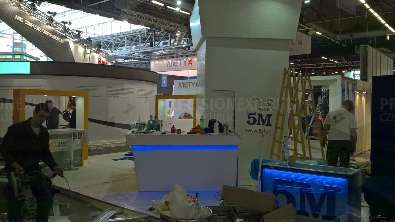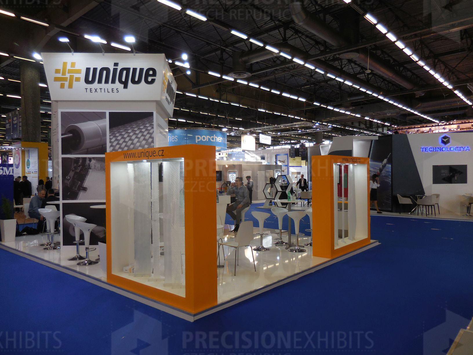 The island includes not only a full-service kitchenette but also a full-scale functional beer bar serving Czech Republic’s signature beverage on tap. Laminated panels are decorated with elegant edge-to-edge graphics, and a 3D design is subtly illuminated in corporate colors. Custom-built cabinets let Unique Textiles and 5M display their products properly. This symmetrical presentation highlights the unique nature of each company while simultaneously underscoring their cooperation and common vision.