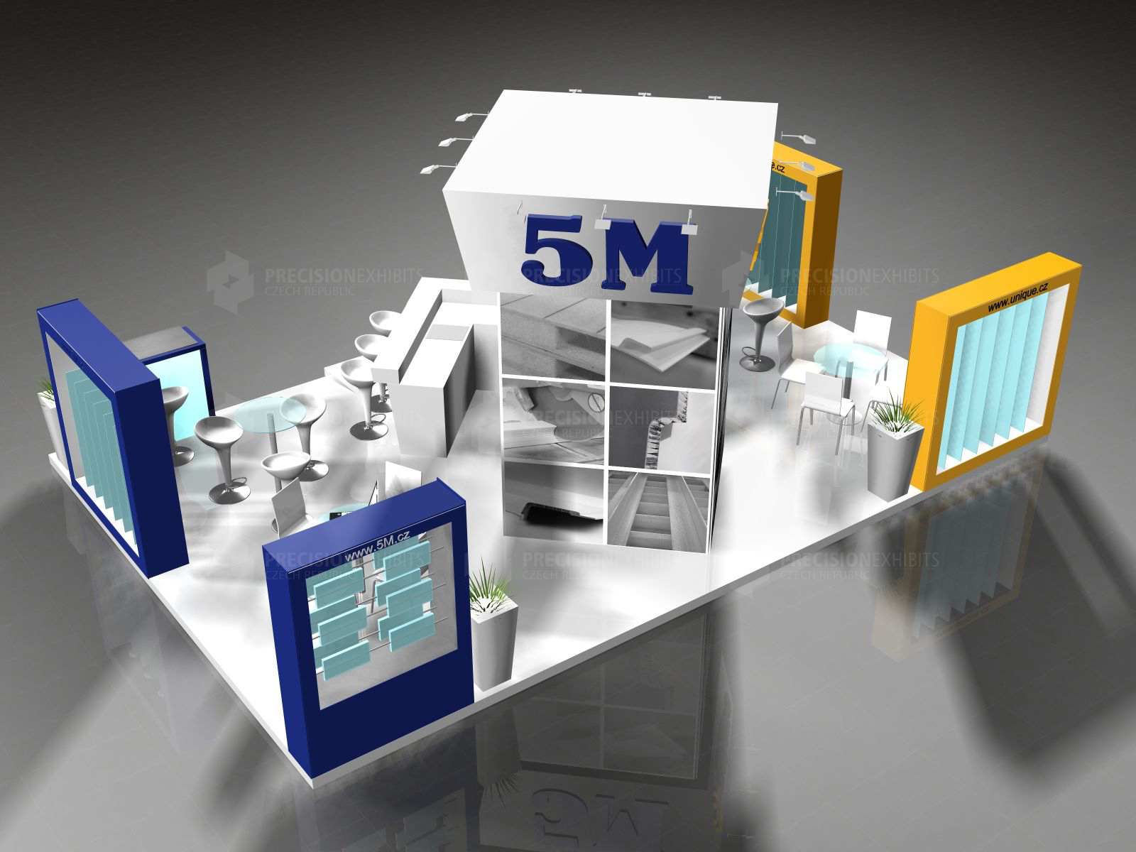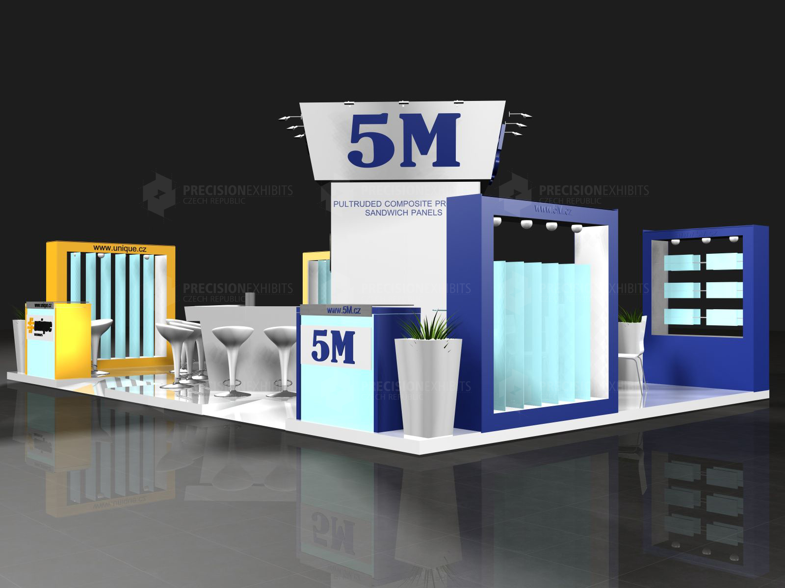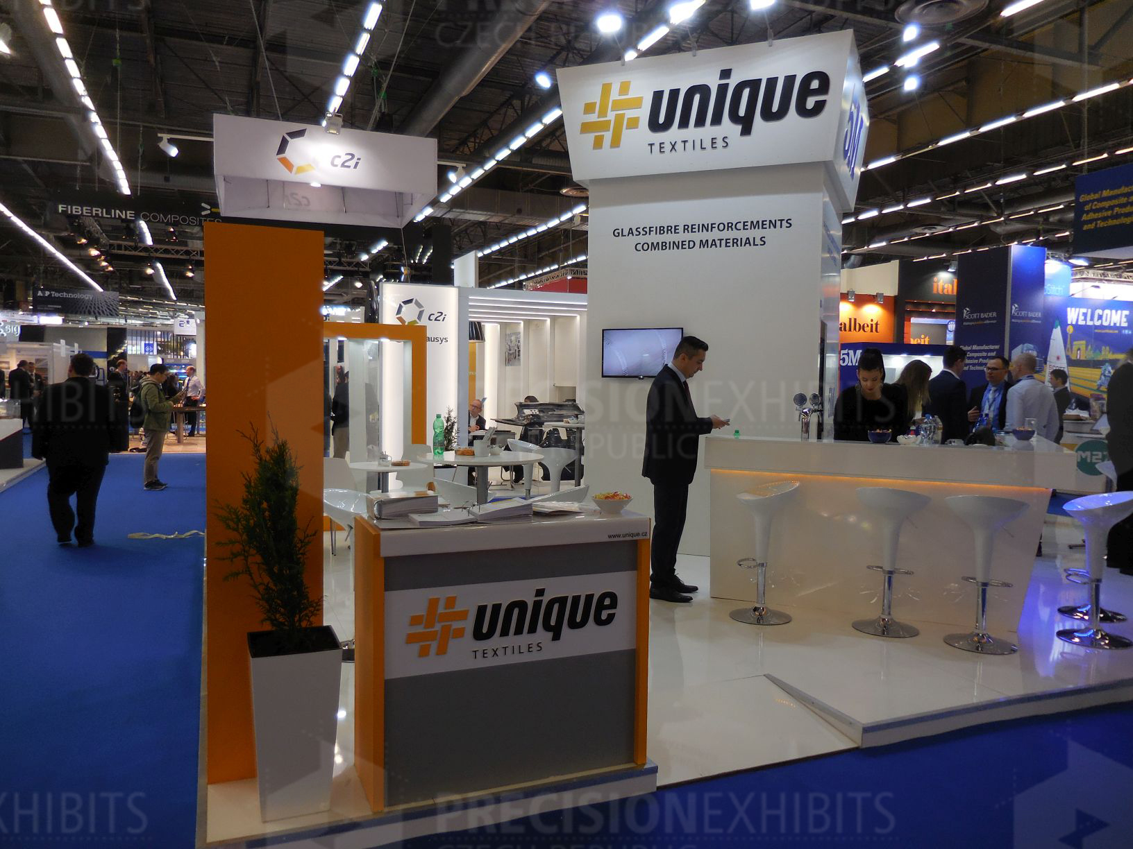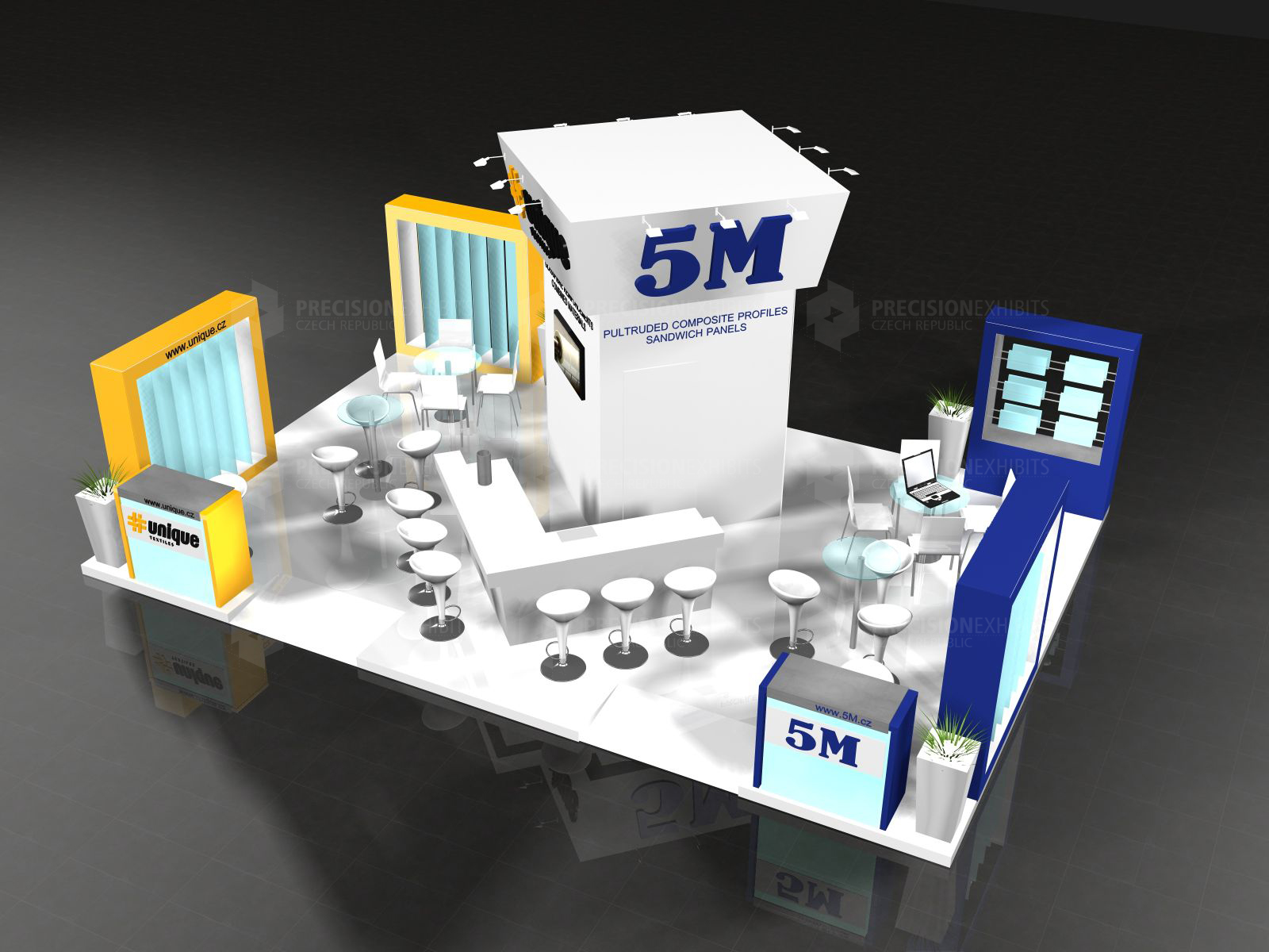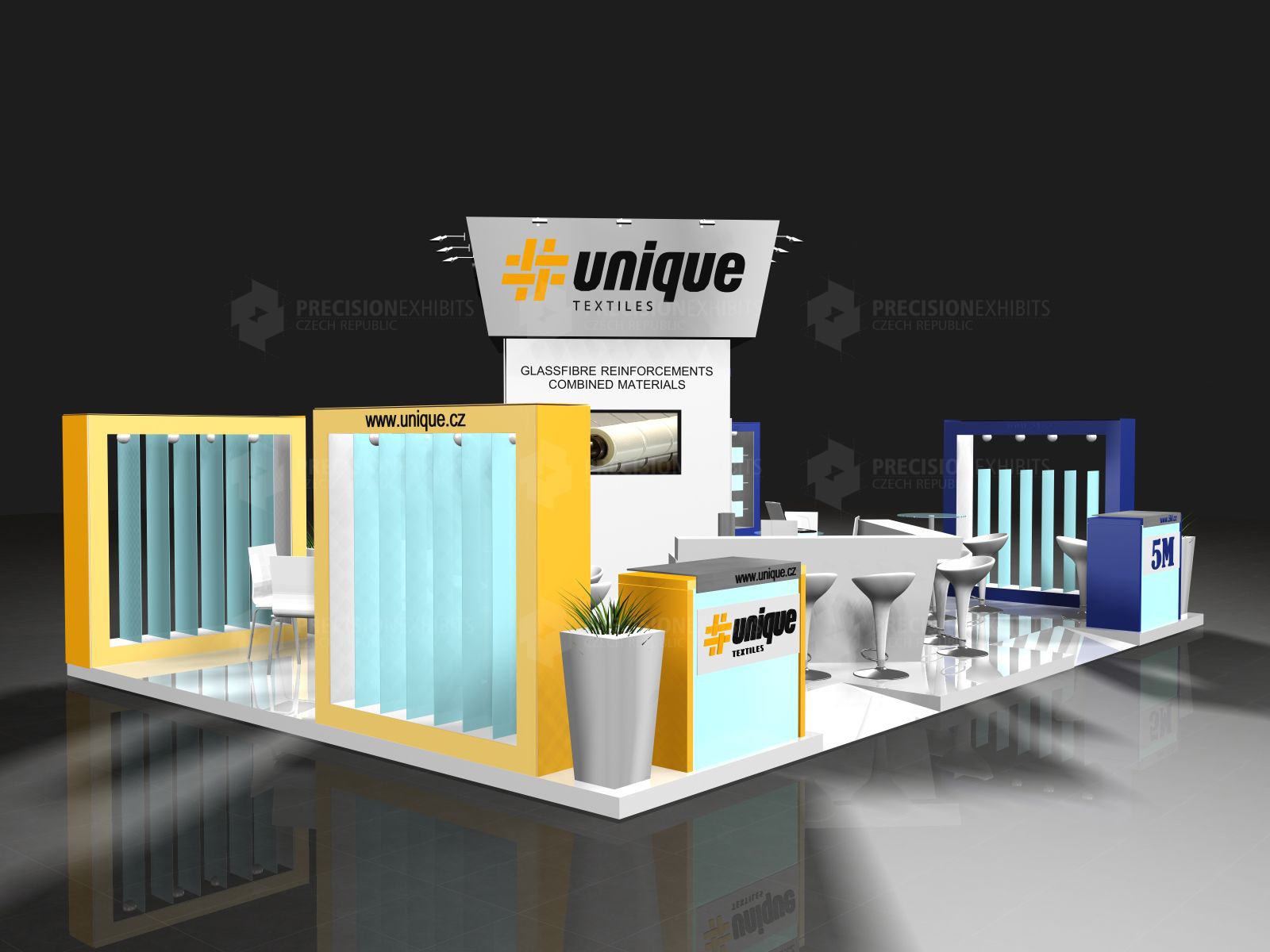 The island includes not only a full-service kitchenette but also a full-scale functional beer bar serving Czech Republic’s signature beverage on tap. Laminated panels are decorated with elegant edge-to-edge graphics, and a 3D design is subtly illuminated in corporate colors. Custom-built cabinets let Unique Textiles and 5M display their products properly. This symmetrical presentation highlights the unique nature of each company while simultaneously underscoring their cooperation and common vision.