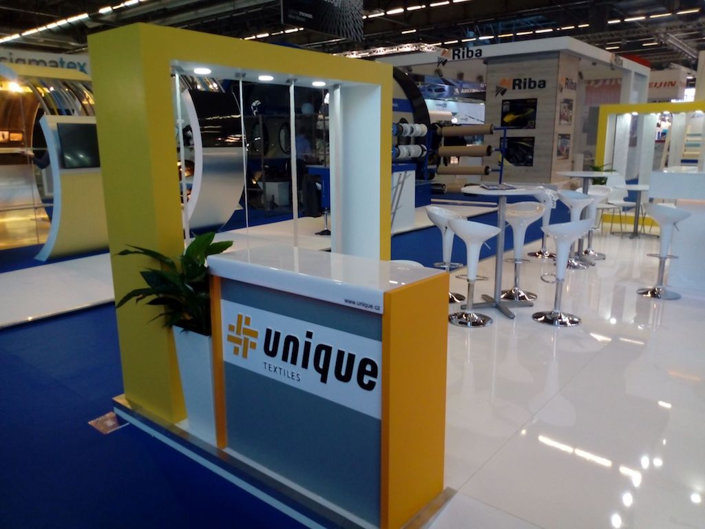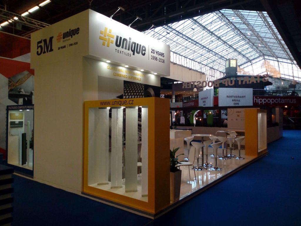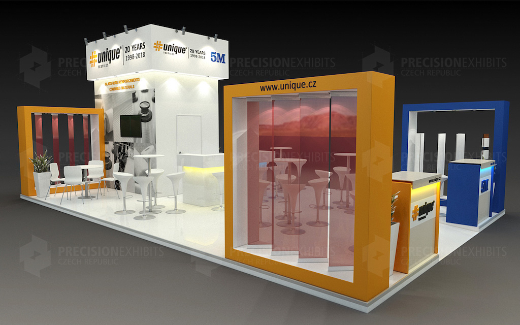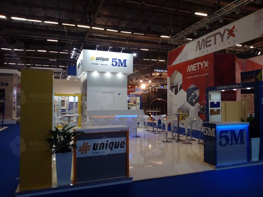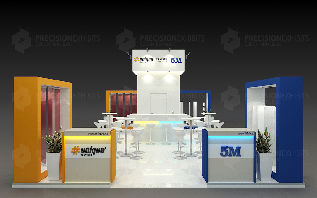 The island includes not only a full-service kitchenette but also a full-scale functional beer bar serving Czech Republic’s signature beverage on tap. Laminated panels are decorated with elegant edge-to-edge graphics, and a 3D design is subtly illuminated in corporate colors. Custom-built cabinets let Unique Textiles and 5M display their products properly. This symmetrical presentation highlights the unique nature of each company while simultaneously underscoring their cooperation and common vision.