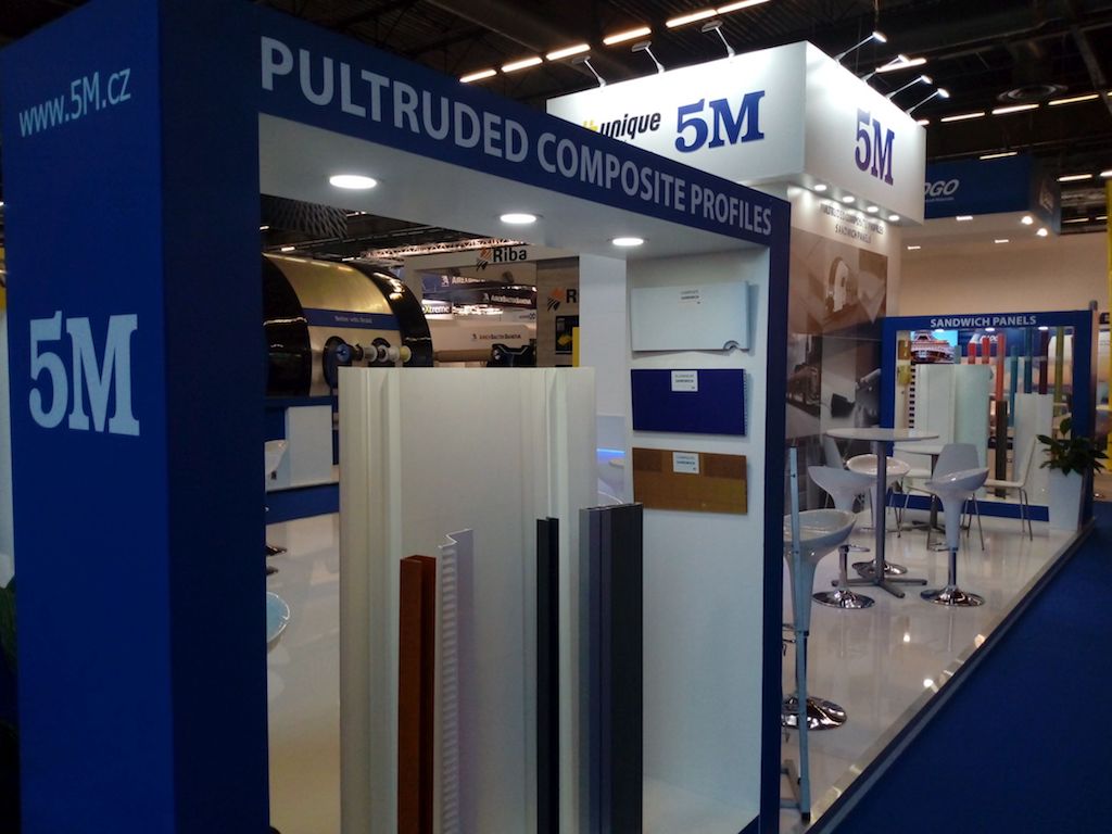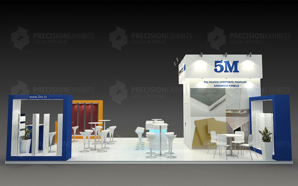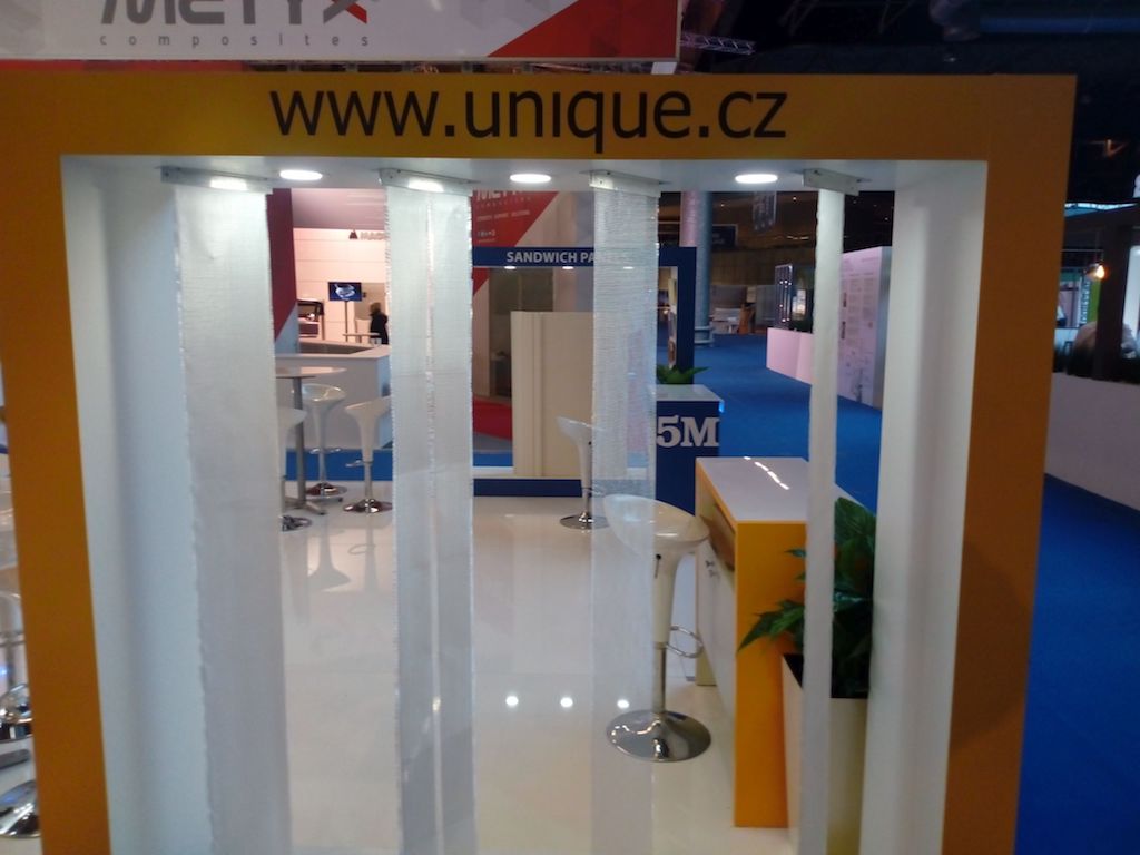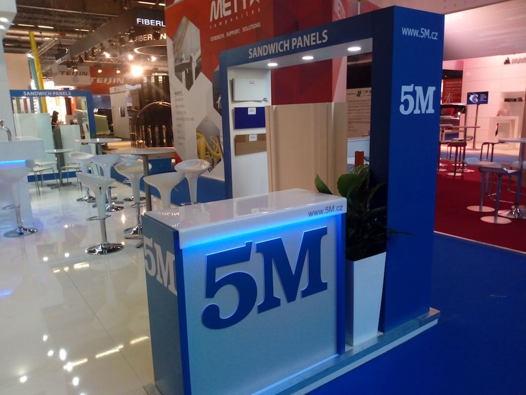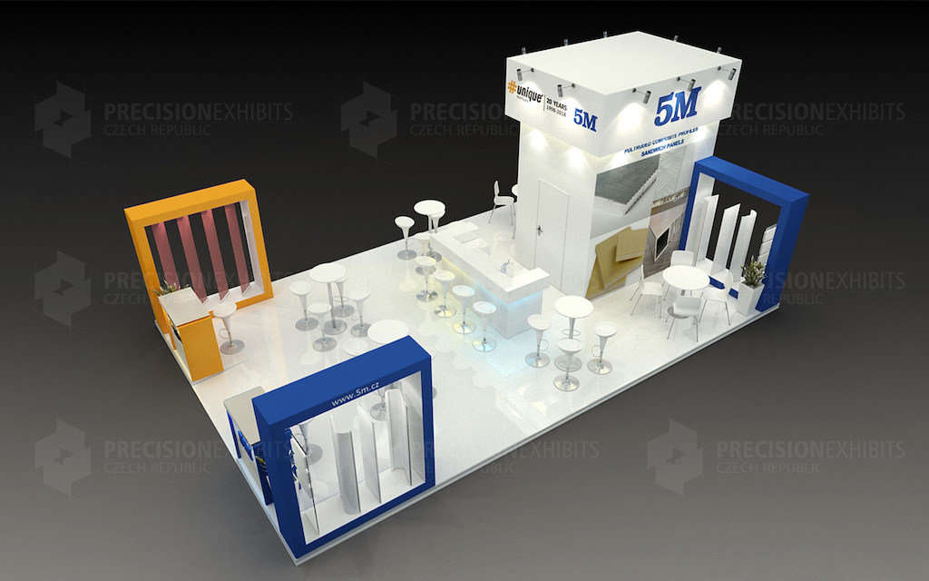 The island includes not only a full-service kitchenette but also a full-scale functional beer bar serving Czech Republic’s signature beverage on tap. Laminated panels are decorated with elegant edge-to-edge graphics, and a 3D design is subtly illuminated in corporate colors. Custom-built cabinets let Unique Textiles and 5M display their products properly. This symmetrical presentation highlights the unique nature of each company while simultaneously underscoring their cooperation and common vision.